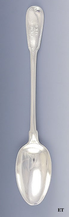 Presented is a wonderful quality French silver serving or platter spoon. This is a pre-Revolution piece, dating to 1775. The spoon is made from French first standard silver, which has a purity of 950. It's worth noting that this is a higher purity than sterling, which is 925. The spoon is done in a lovely traditional Fiddle Thread pattern. The back of the handle has an old monogram of IP, while the front has a newer monogram of C.L.W.F to M.L.P.