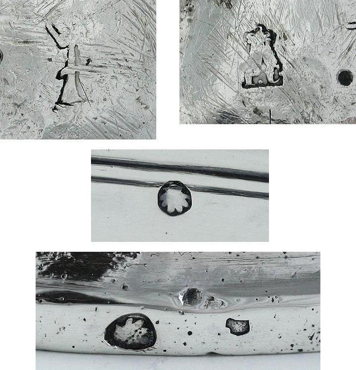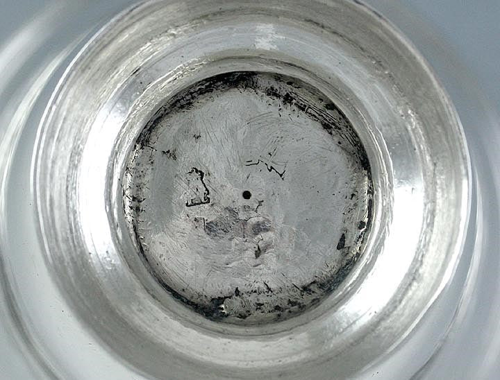 The cup is hallmarked on the underside with the Paris charge mark of a crowned A, used between 1783-1789 for French first standard 950 purity silver and a maker’s mark of P.C with a glyph above it. Unfortunately the glyph is too worn to decipher. There also appears to be another hallmark , barely visible, an L with a crown above. This hallmark is far too worn to photograph. The cup is also stamped twice, below the rim and on the base, with a little shell or clam mark. We are not sure what this mark is.