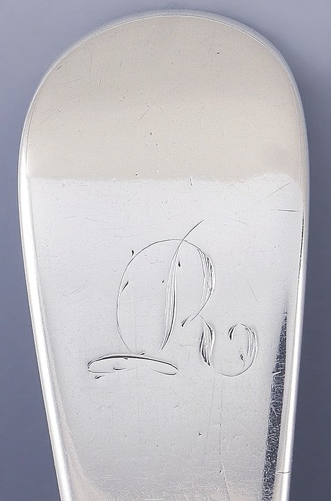 Presented is a great English Georgian sterling silver platter spoon or stuffing spoon. This piece dates to 1781. The spoon has a long handle with a downward turn at the end. The end of the handle has a monogram of R, possibly over a monogram removal. If there was a monogram removal in the past, it was quite well done.
