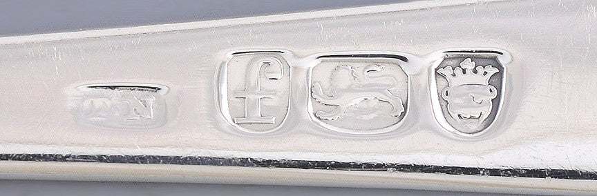 This piece is hallmarked on the underside with the lion passant for sterling silver, the leopard's head crowned for the city of London, the date letter f for 1781, and a maker's mark of TN, likely for Thomas Northcote or Thomas Nash.