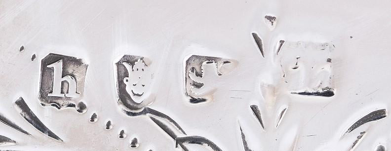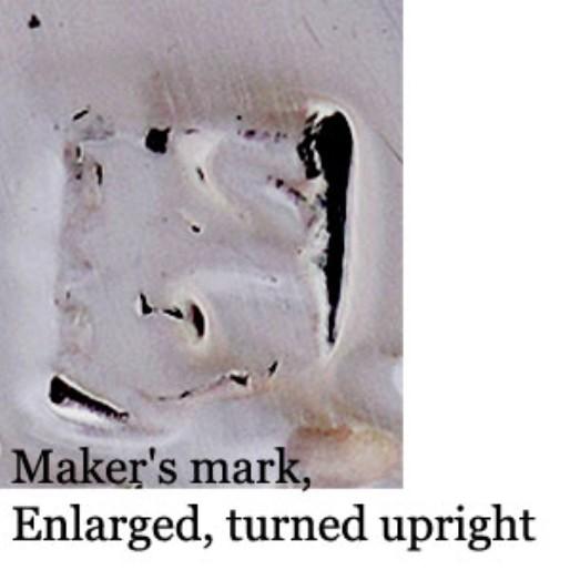 This piece is hallmarked on the underside with the lion passant for sterling silver, the leopard's head crowned for the city of London, the date letter h for 1783, and a maker's mark that is mostly rubbed but appears to be IS over IB, for James Sutton & James Bult.