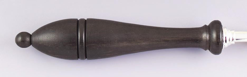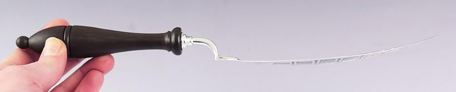 The fish server is in good overall condition. There has been a monogram removed from the center of the cartouche, but the silver is still thick. There are no chips, no splits, and no repairs to the wooden handle. The silver has no splits, no dents, no monograms, and no solder repairs.