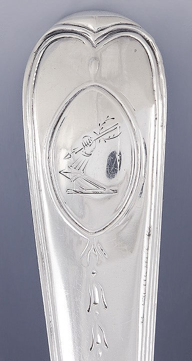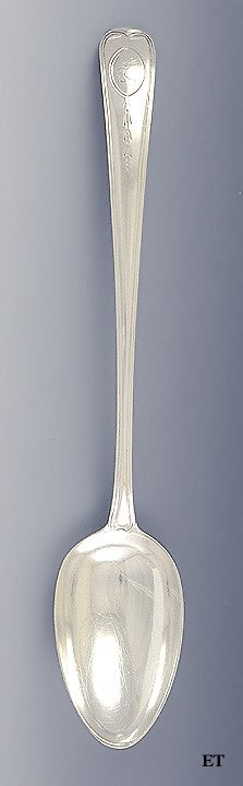Presented is a wonderful Irish sterling silver serving or basting spoon. This piece dates to 1787 and was made by John Osborne. The spoon is done in a classic Threaded pattern, with a downward turn to the end of the handle. The handle has a nicely engraved crest of an armoured hand holding an arrow, inside an oval cartouche. Beneath this is an engraved floral design.