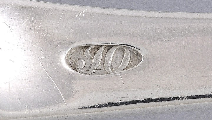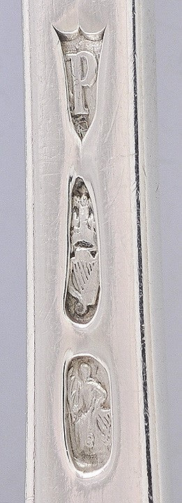 This piece is hallmarked on the stem with the Hibernia mark for sterling silver, the harp crowned for the city of Dublin, the date letter P for 1787, and the maker's mark for John Osborne
