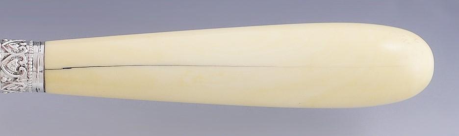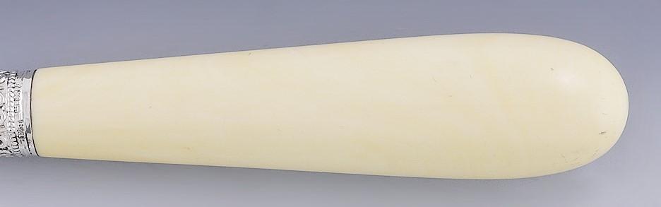 This piece is in great overall condition. The handle or at least the silver collar joining it to the blade is a replacement. The handle has a vertical age line, but is tight to the blade and sturdy. The silver has no splits, no dents, no breaks, no monograms, no monogram removals, and no repairs.