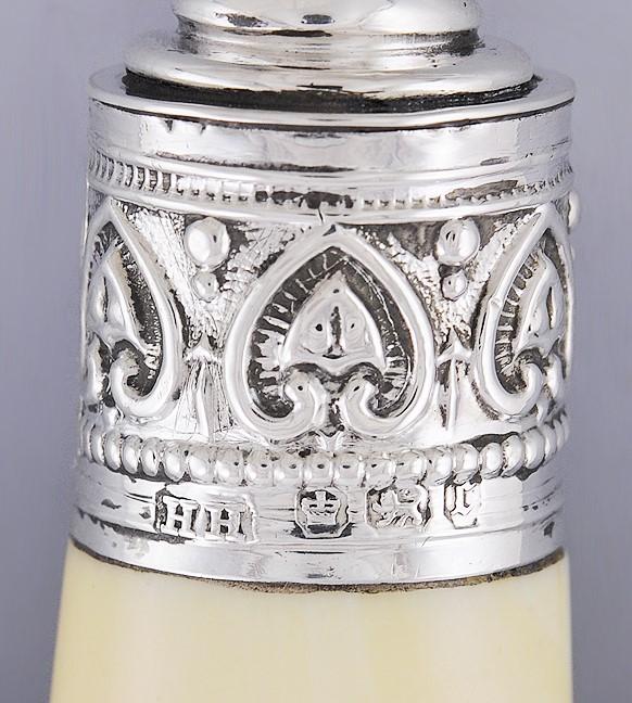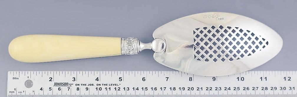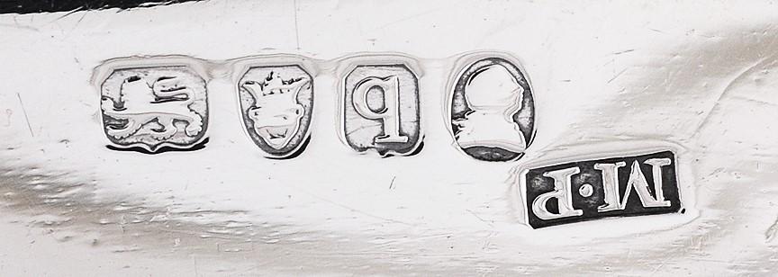 This piece is hallmarked on the underside of the blade with the lion passant for sterling silver, the leopard's head crowned for the city of London, the date letter q for 1790, King George III's head duty mark, and the maker's mark for Michael Plummer. The collar joining the blade to the handle is hallmarked with the lion passant for sterling silver, the crown for the city of Sheffield, the date letter C for 1895, and the maker's mark for Harrison Brothers & Howson.