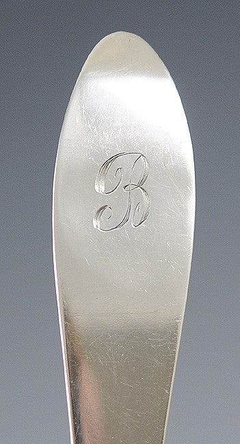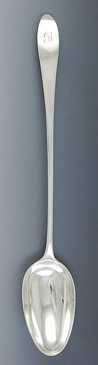 Presented is a nice antique Scottish sterling silver serving spoon. This piece dates to 1790. This is a large, long-handled spoon, sometimes called a platter or stuffing spoon, and is appropriate for any general serving purpose. The spoon is done in a very simple and clean style. The handle is monogrammed with a 'B' in elegant script. This is a wonderful antique piece of Scottish silver, and would be an excellent addition to any table or collection.