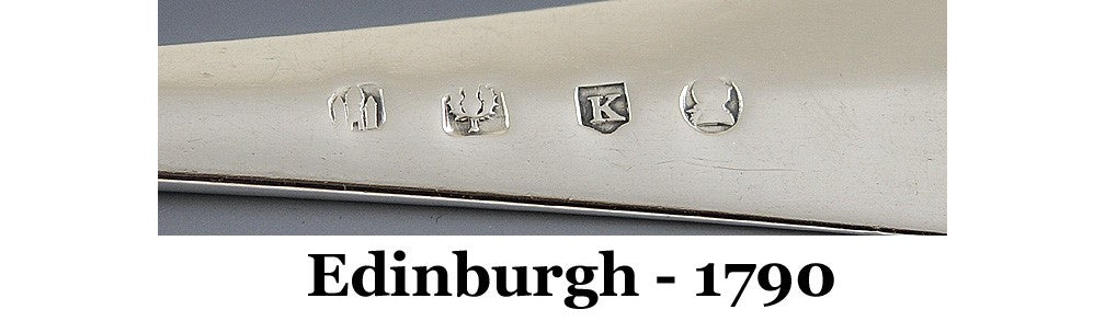 This piece is hallmarked with the thistle guarantee mark for sterling silver, the towers mark for the city of Edinburgh, the date letter K for the year 1790, and the King George III head duty mark.