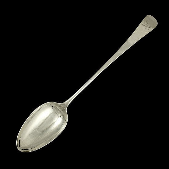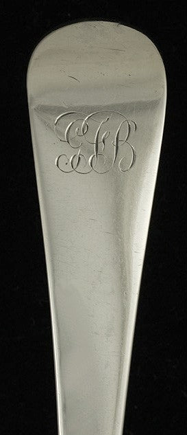 Presented is a fine quality, English sterling silver stuffing or platter spoon made by Jonathan Perkins I of London in 1800. This piece is in a classical, long form. The tip of of the handle has an old, original monogram of the initials GFB.