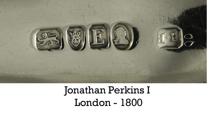 The back of the handle is marked with the crowned leopard’s head for London, the lion passant for sterling silver, a duty mark of King George III’s head, a date letter E for the year 1800s and a maker’s mark for Jonathan Perkins I.
