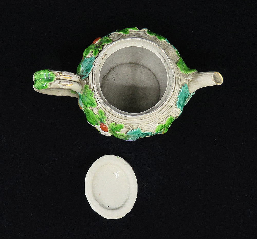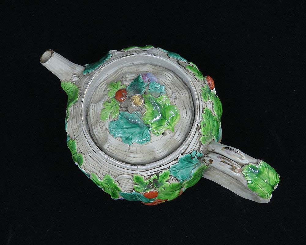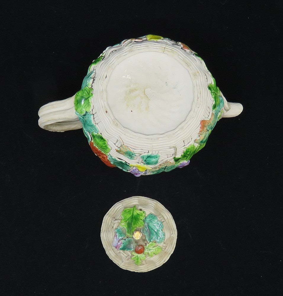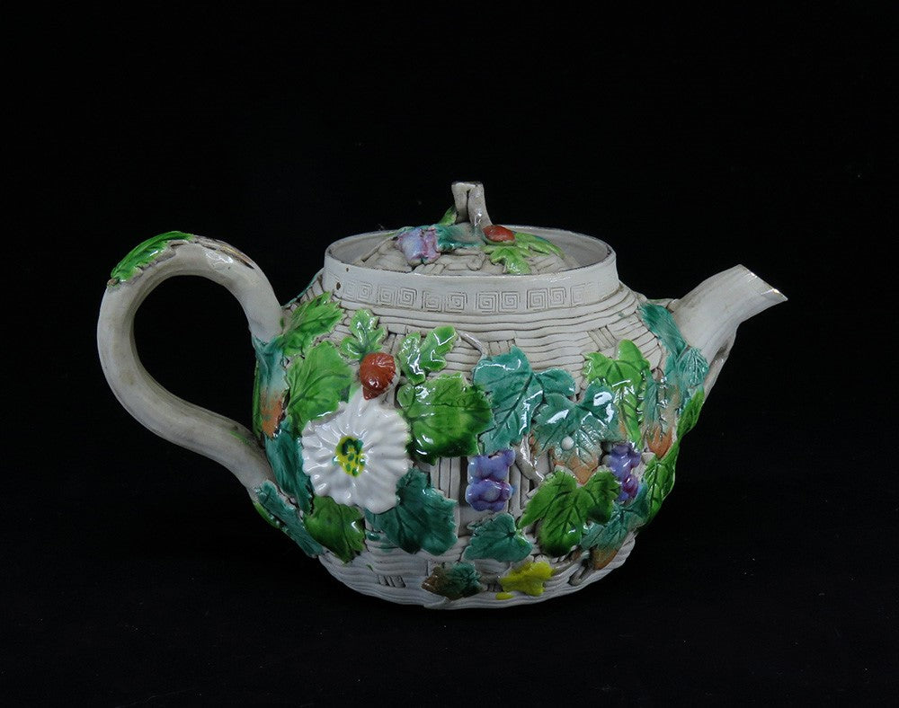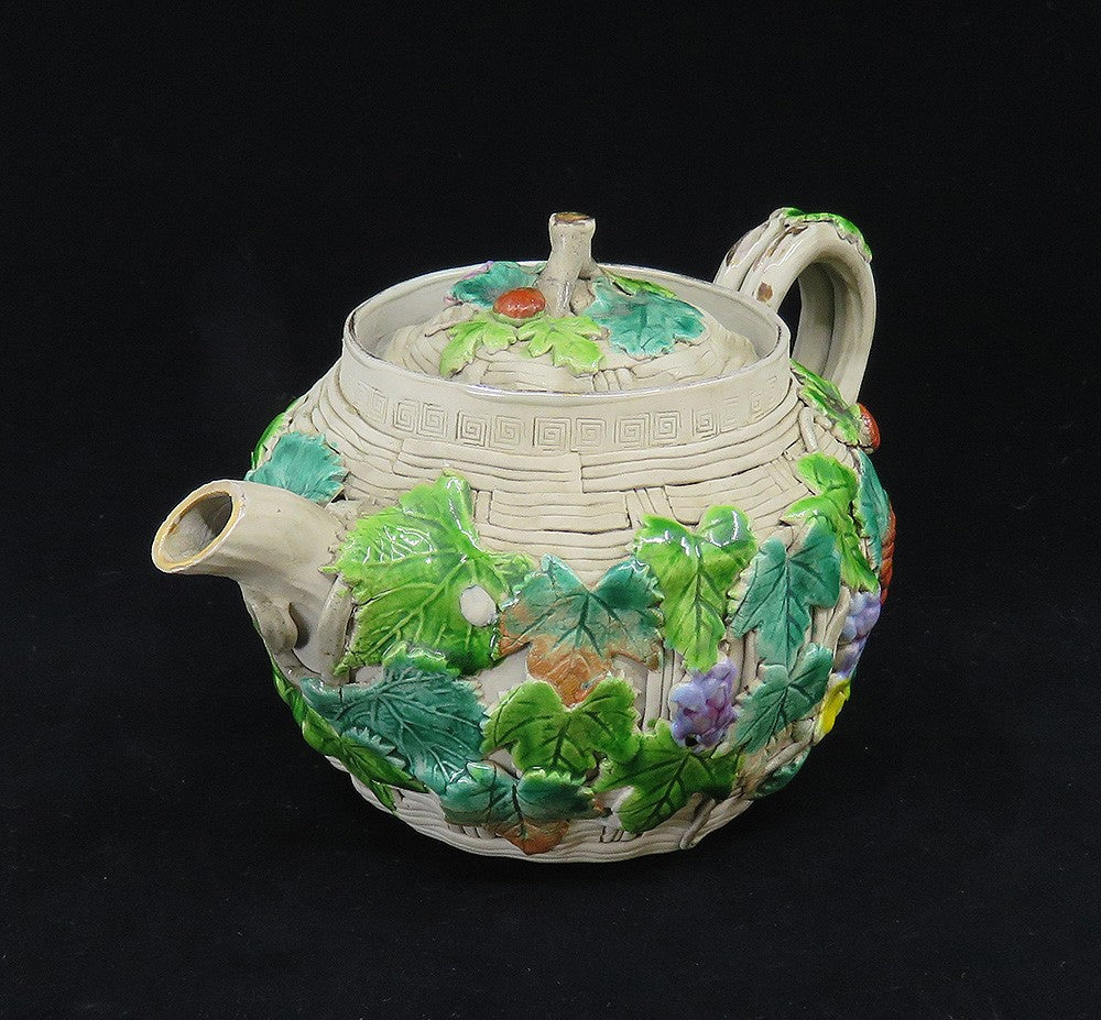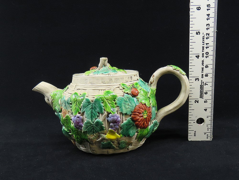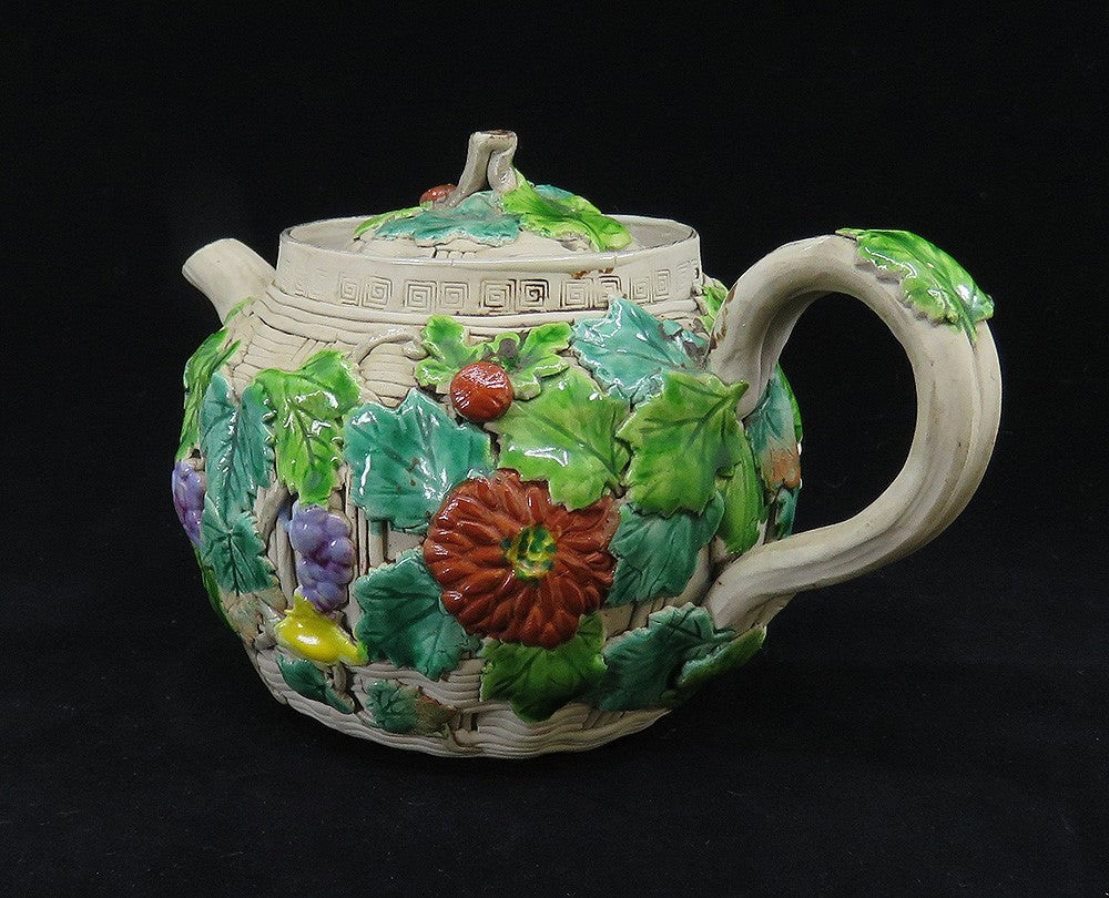 Antique 1800s Japanese Banko Colorful Pottery Fruit Flowers Basket Form Teapot
