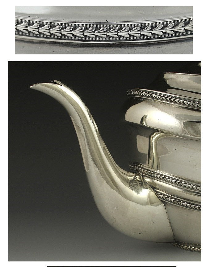 Presented is a fine quality English Georgian sterling silver coffee pot or teapot made by John Emes of London. The pot is decorated with four bands of elegant die rolled leaf decoration and has a black wooden handle and finial. The finial is attached with the old bolt construction underneath.