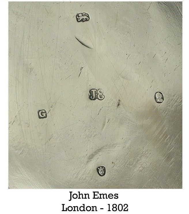 The pot is fully hallmarked on the underside with the lion passant for sterling silver, the leopard’s head crowned for London, the date letter ‘G’ for 1802, the duty mark of King George III’s head, and a maker’s mark of JE for John Emes. The underside of the lid is also stamped with the lion passant.