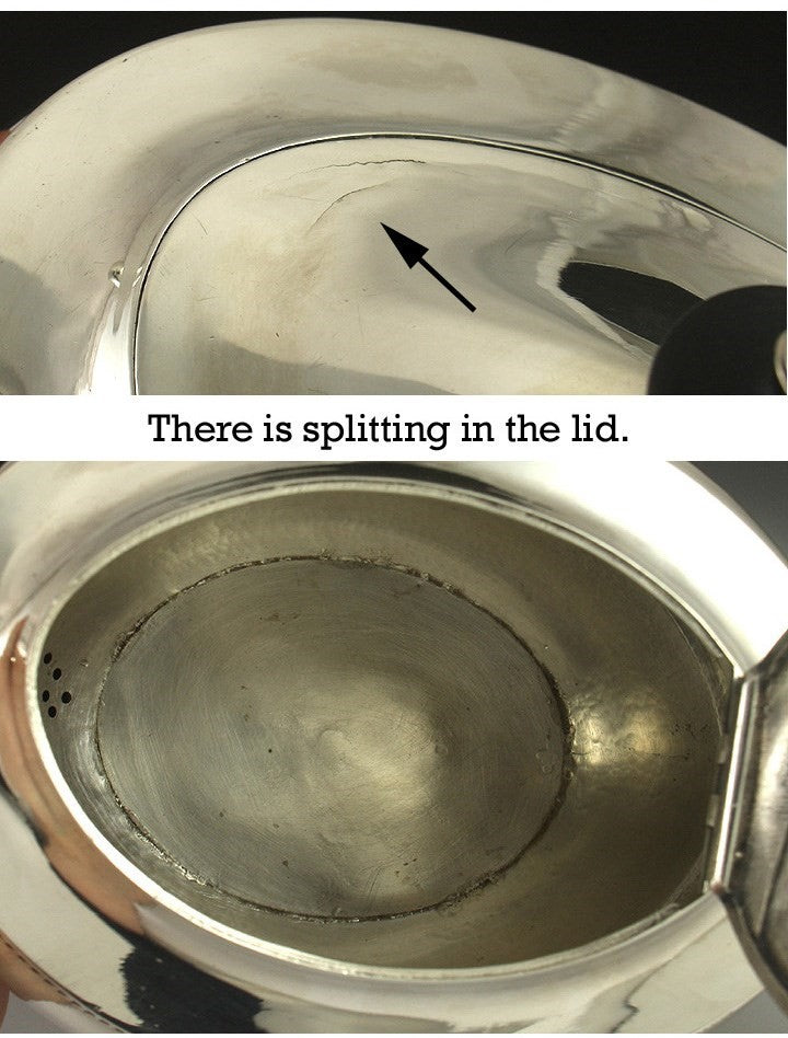 The condition is excellent. There are two small splits to the lid which we have pointed out in the photographs, and there are a few little dents and dings here and there, but this is quite minor. The handle is tight to the body. I believe the handle has been repainted at the very least if not replaced. The wood finial is also repainted if not replaced. The pot is clean on the interior and ready to use. There are no dents, no other splits, no breaks, and no repairs other than those already mentioned.