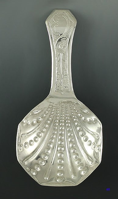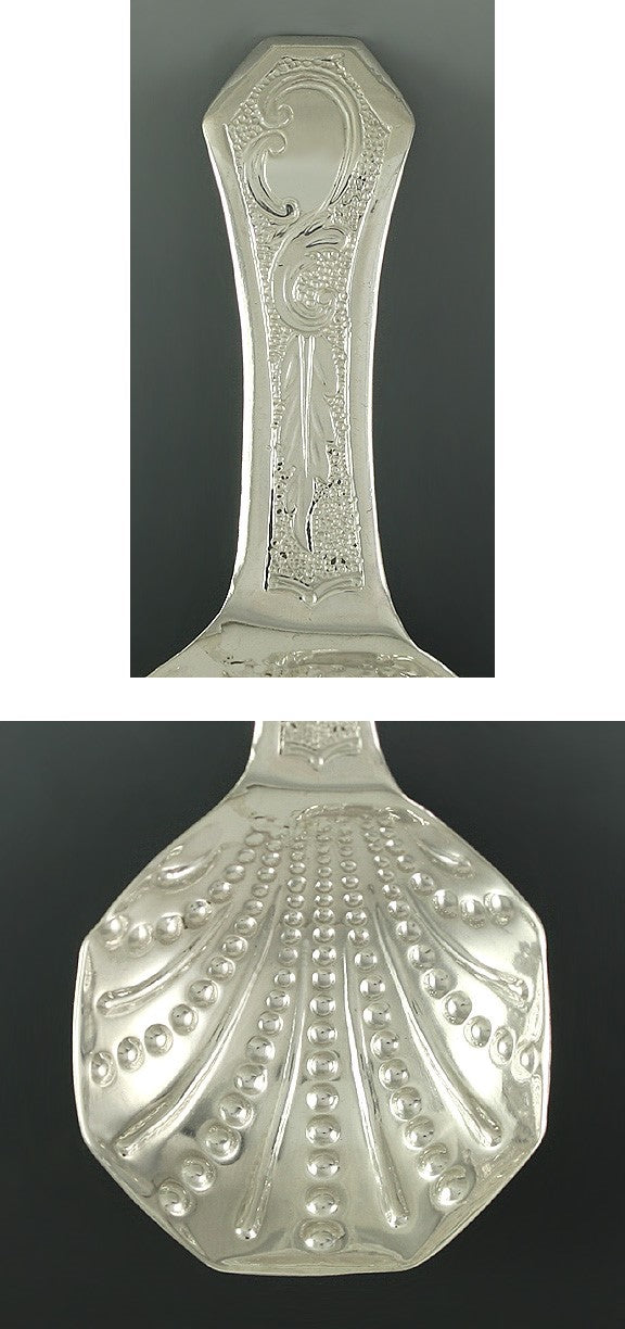 Presented is a neat, English sterling silver tea caddy scoop made in Birmingham in 1803. The bowl is octagonal and has an interesting raised bead and line design. The coffin-end handle is hand chased and engraved with leaf decorations over a stippled background. This is a wonderful quality piece.