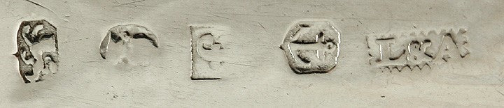 The handle is marked with the anchor mark for Birmingham, the lion passant for sterling silver, a duty mark of King George III’s head, a date letter f for the year 1803 and an unknown maker’s mark of L & A.