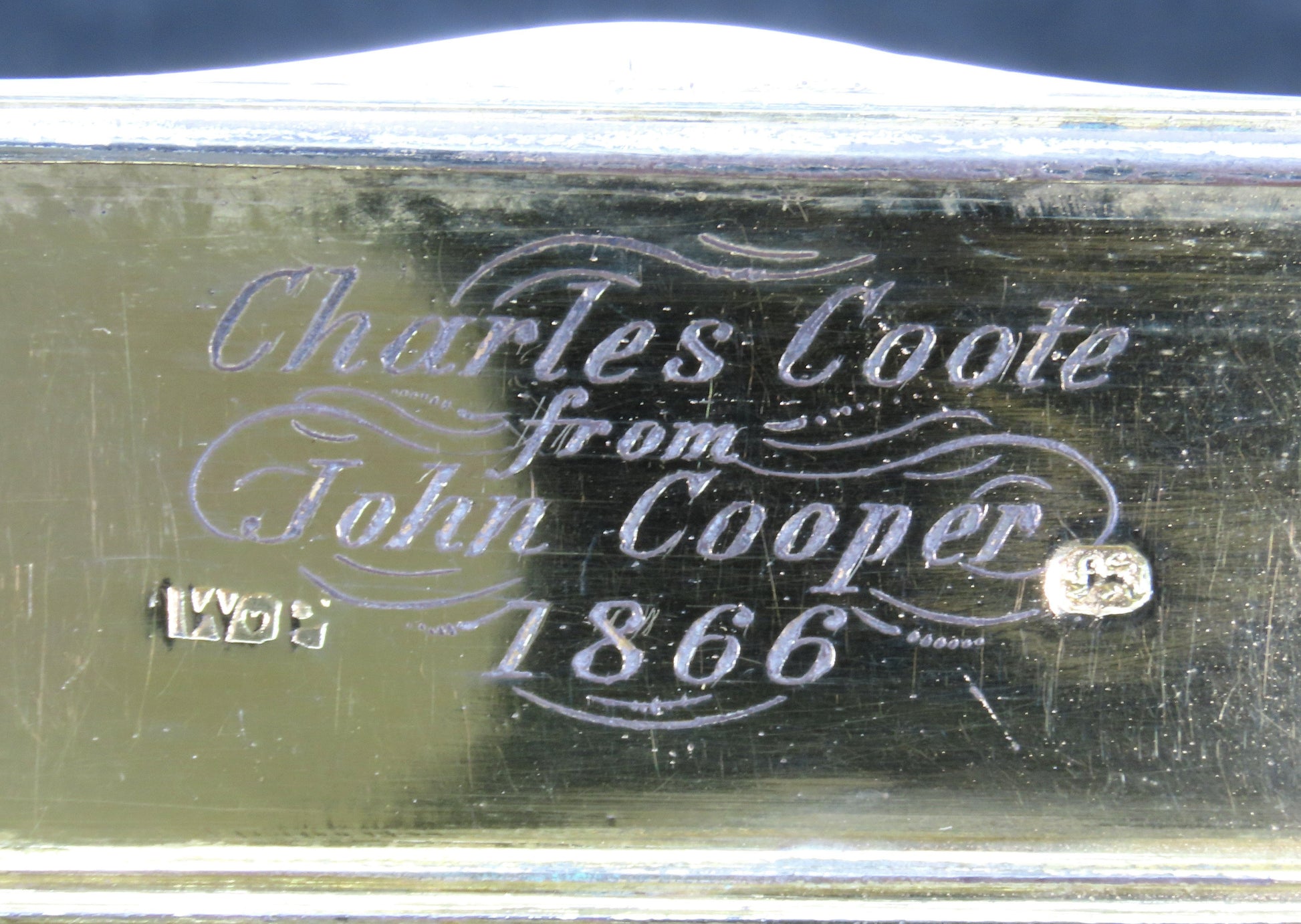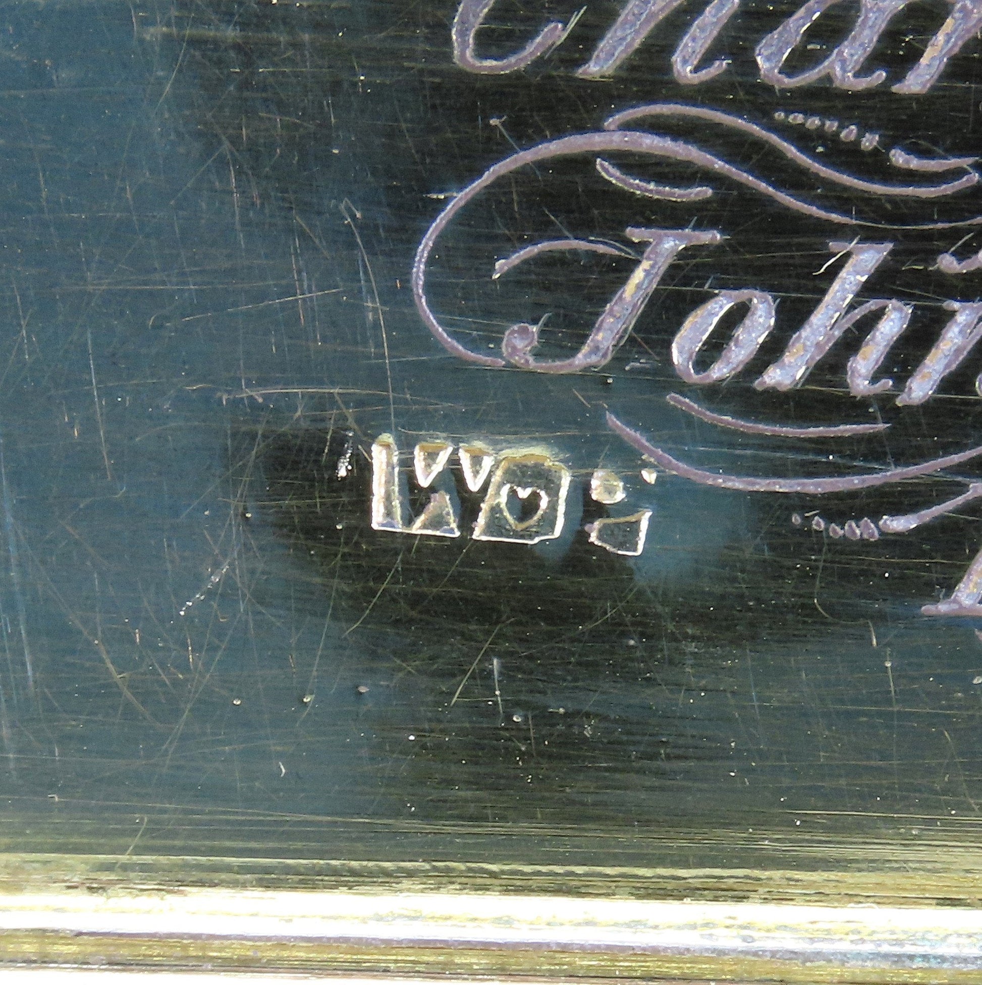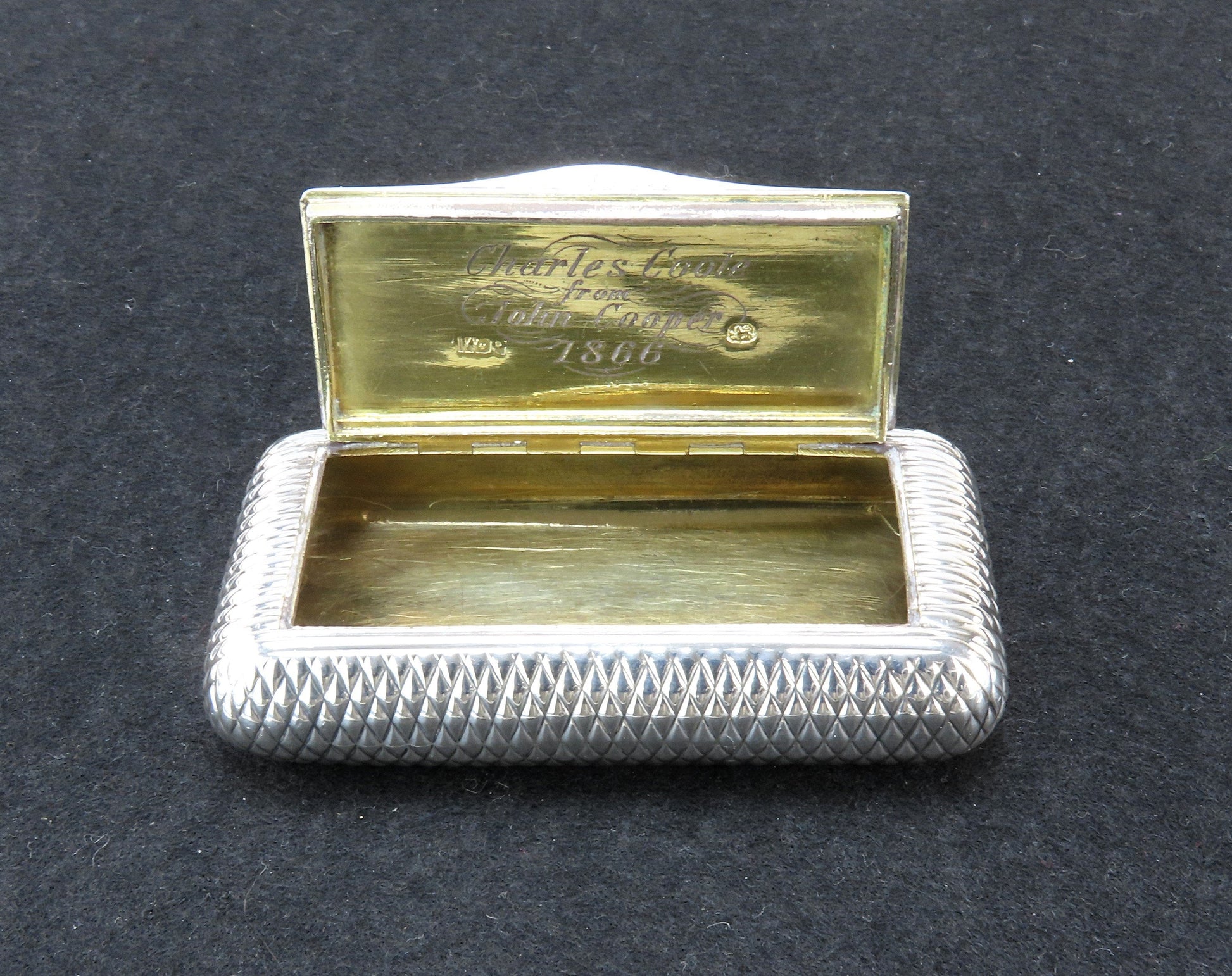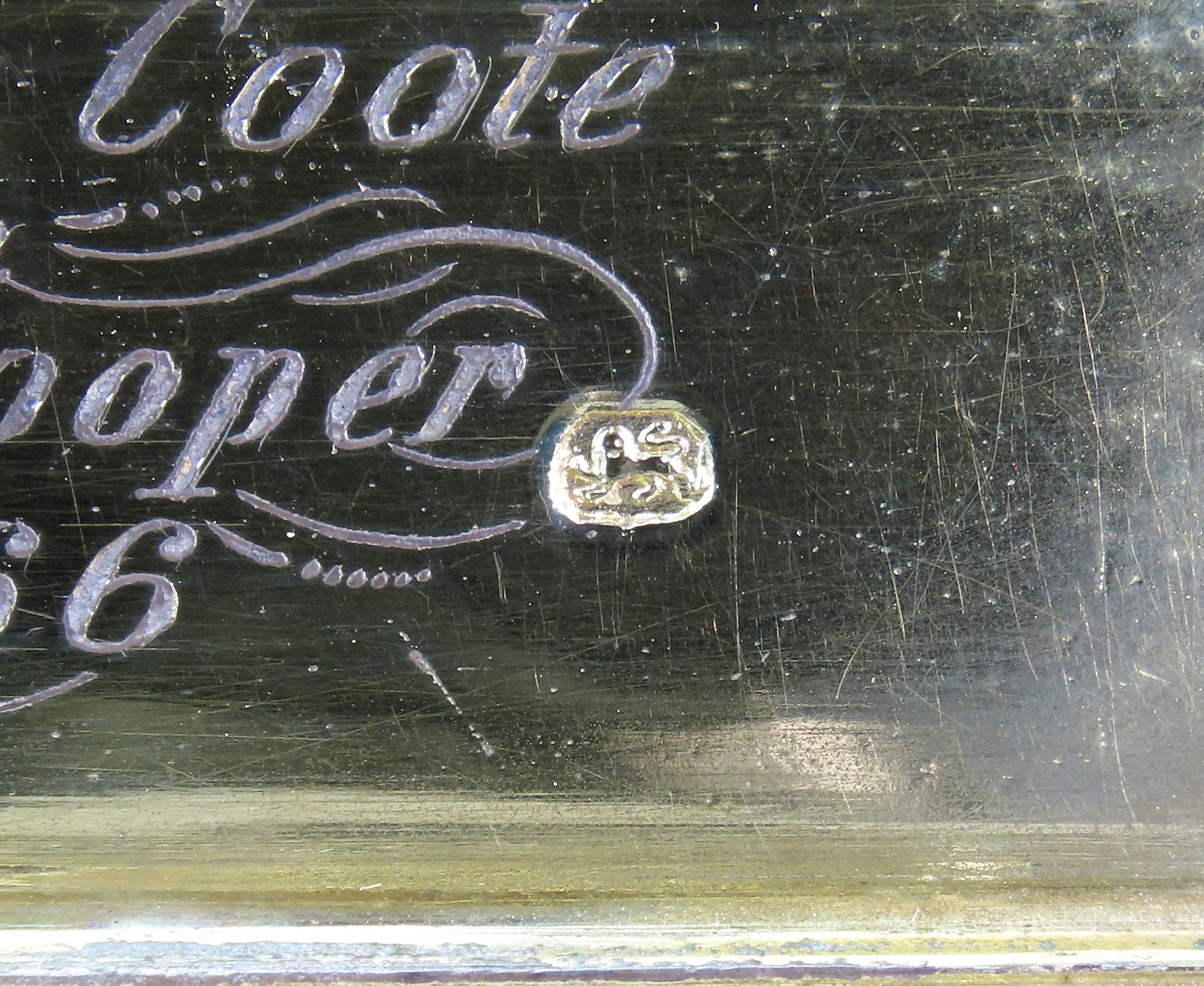 On the inside of the lid is a presentation with a date of 1866. The inside bottom of the snuff box is marked with the a maker's mark for William Purse, the lion passant for sterling silver, a leopard's crowned head for London, a date letter I for the year 1804, and a duty mark of King George III's head. The inside of the lid has a maker's mark for William Purse and the lion passant mark for sterling silver.
