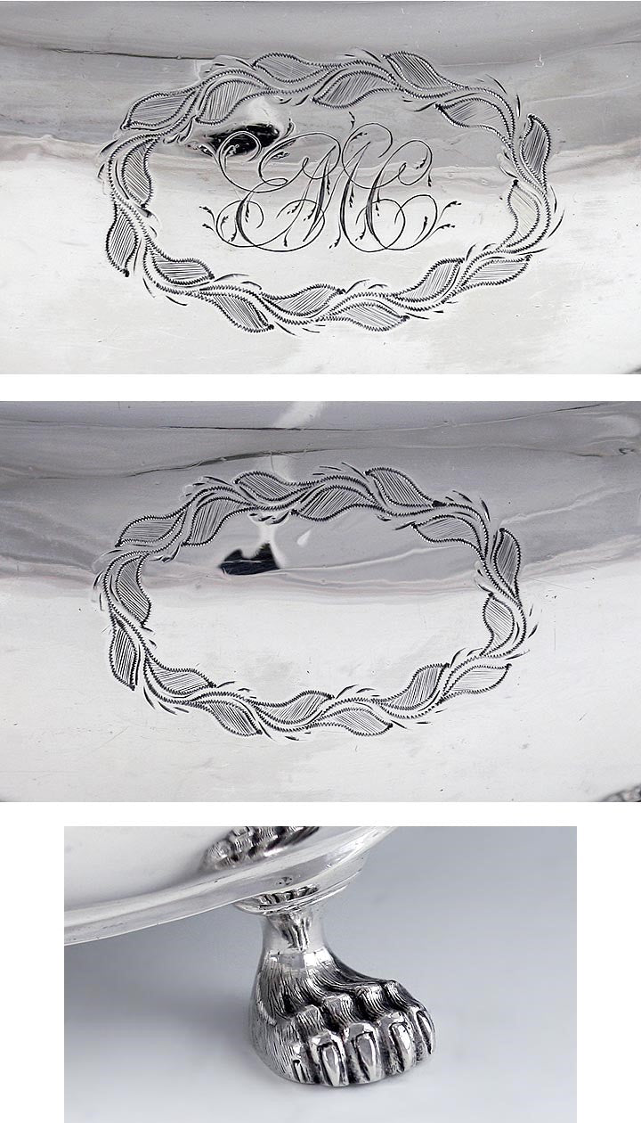 Presented is a great sterling silver or coin silver teapot by John & Peter Targee. It was made between 1800-1810 in New York. The teapot is rectangular shaped. The pot stands on nicely detailed clawed feet. The spout has a recessed double-lobed top. Both sides of the teapot are engraved with beautifully detailed wreaths that form cartouches. One cartouche has never been monogrammed and the other has the original monogrammed initials EMC.