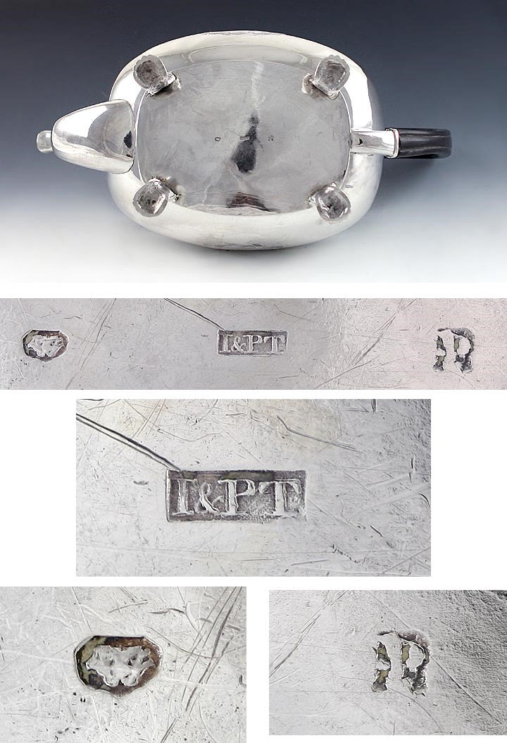 The teapot is marked on bottom with John and Peter Targee's initials and two of their pseudo-hallmarks. We have tested this piece and guarantee it to be at least 900 silver if not a little higher. It is very likely the piece is actually 925 purity and sterling silver purity. To be honest, it really doesn't matter, as the piece is solid silver.