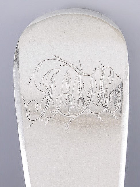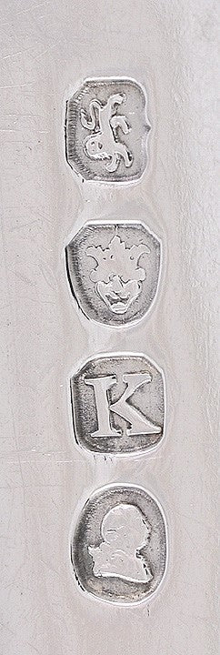 This piece is hallmarked on the underside of the handle with the lion passant for sterling silver, the leopard's head crowned for the city of London, the date letter K for 1805, King George III's head duty mark, and the maker's mark for Thomas Barker.