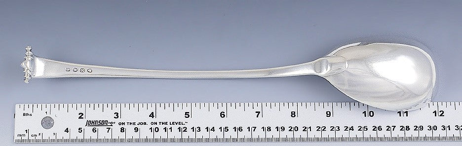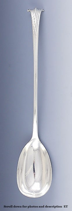 Presented is a wonderful quality English Georgian sterling silver serving spoon. This piece dates to 1805. The spoon has a long handle with an Onslow or Scroll style terminal. The bowl of the spoon is long and pear shaped.