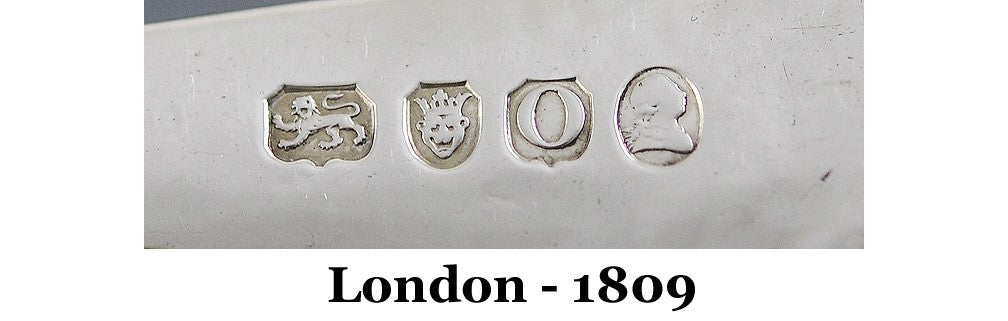 This piece is hallmarked on the stem with the lion passant for sterling silver, the leopard's head crowned for the city of London, the date letter O for 1809, and the King George III head duty mark.