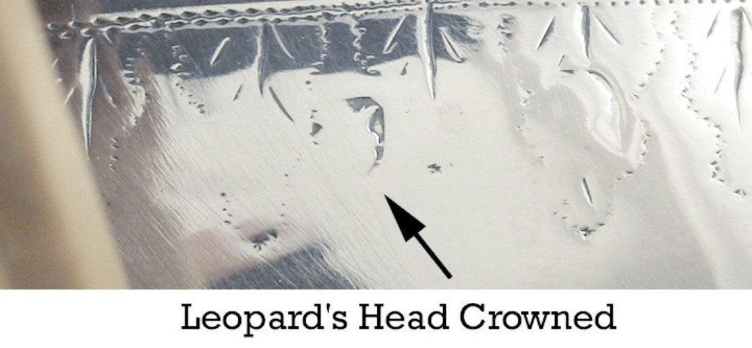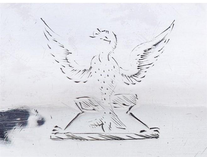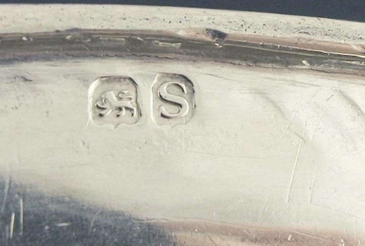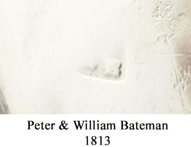 The pot is hallmarked below the rim with the lion passant for sterling silver, the date letter ‘s’ for 1813, and a maker’s mark. Only the letters WB are visible, but clearly there were other letters about this. The only English maker that this pot could be his Peter and William Bateman. These hallmarks are on the lid. The hallmarks on the side of the pot are too worn to make out, except for the leopards head crown for London.