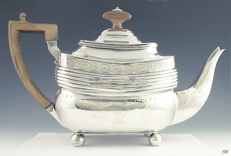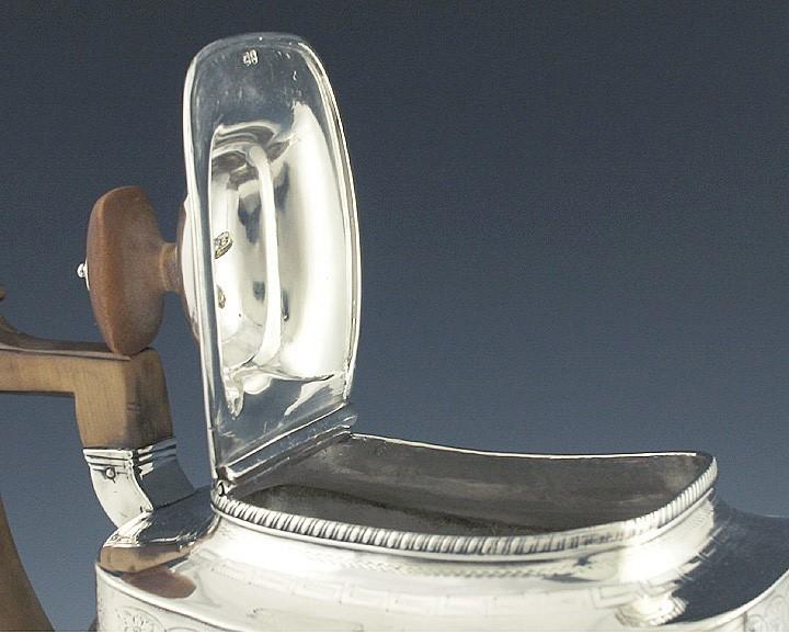Presented is a fine antique English sterling silver tea or coffee pot almost certainly made by Peter and William Bateman. The pot is raised up on four ball feet and has a handsome wooden handle and finial. The pot has a gadrooned design around the rim with a Greek key motif engraved below. The shoulder is engraved with a repeating design of flowers with a band of leaves below. The front of the piece is engraved with a great crest of an eagle or another similar bird.
