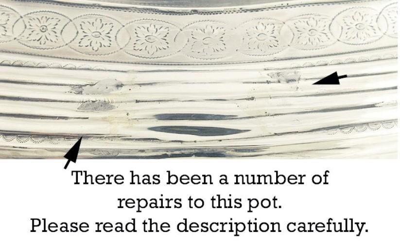 This pot has numerous repairs. The front of the pot has three repairs around the widest part of the body. There are also a couple of repairs where the legs attach and on the edges of the spout as shown in the photographs. In addition, the wood handle has a small chip to the top corner on the front side of the pot. Obviously something less than perfect condition. The handle is tight to the body.