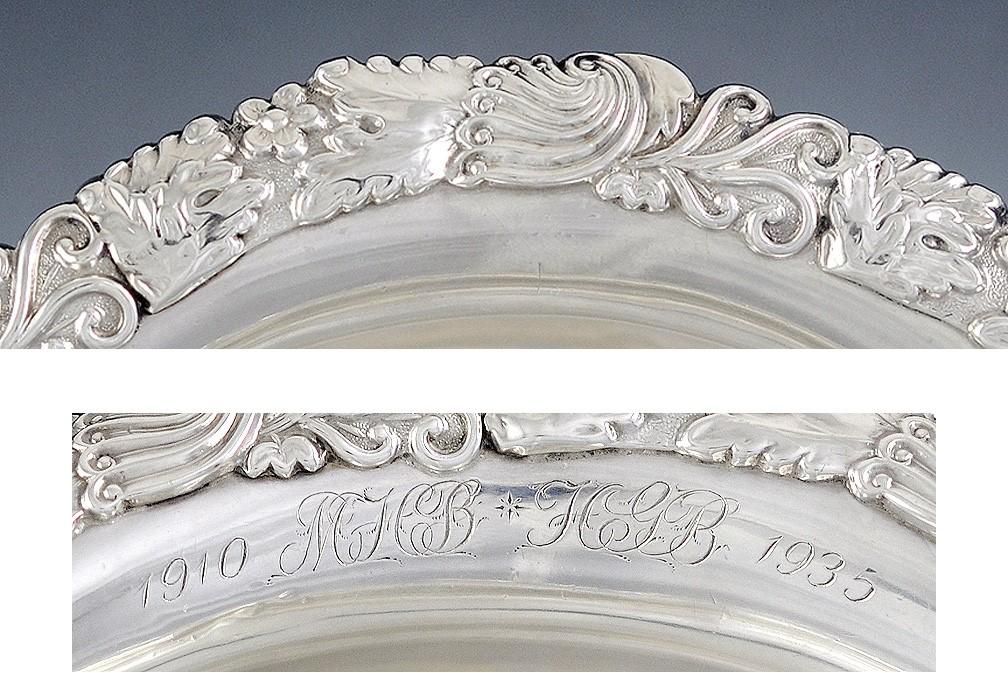 The rim is beautifully decorated with flowers and scrolls. The sides of the bowl are designed with raised floral swags or festoons and flower medallions. There is a monogram on the piece of the dates and initials: 1910 MHCB HGB 1935; this monogram was added over 100 years after the actual production of the piece. This is a wonderful, early 19th century piece.