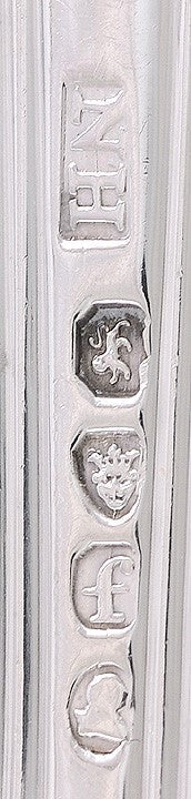 This piece is hallmarked on the underside of the handle with the lion passant for sterling silver, the leopard's head crowned for the city of London, the date letter f for 1821, King George III's head duty mark, and the maker's mark for Henry Nutting.