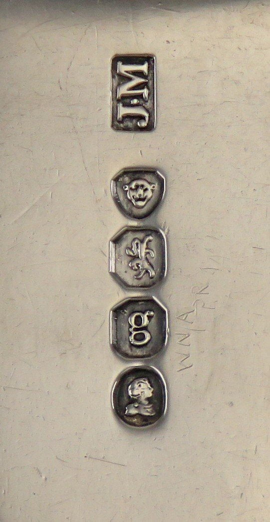 The back is marked with the leopard’s head for London, the lion passant for sterling silver, a duty mark of King George IV’s head, a date letter g for the year 1822 and a maker’s mark of the initials JM.