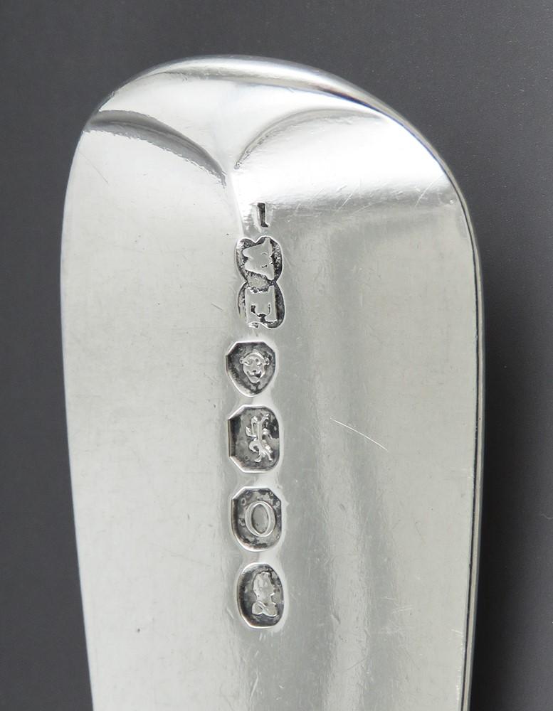 The back of the handle is hallmarked with the leopard's head for the city of London, the lion passant for sterling silver purity, a duty mark of the king's head, a date letter o for the year 1829 and a maker's mark for William Eaton.