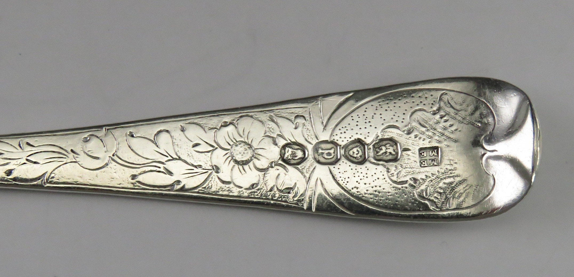 Presented is a very fine quality, antique English sterling silver serving spoon made in London in 1830. This piece is done in a classical form of the time. The front and back of the handle are engraved with flower and leaf decorations and the front bears a monogram of the initials A, V and M. The bowl is hand chased with fruits and engraved with leaves.