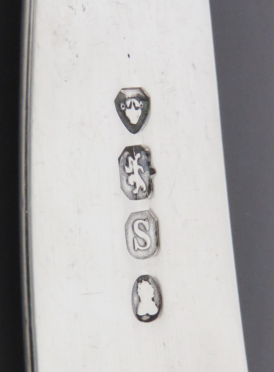 The tongs bear the leopard head mark for the city of London, the lion passant for sterling silver, a duty mark of the king's head, a date letter S for the year 1833 and a maker's mark for William Barret II( although faded, still readable).