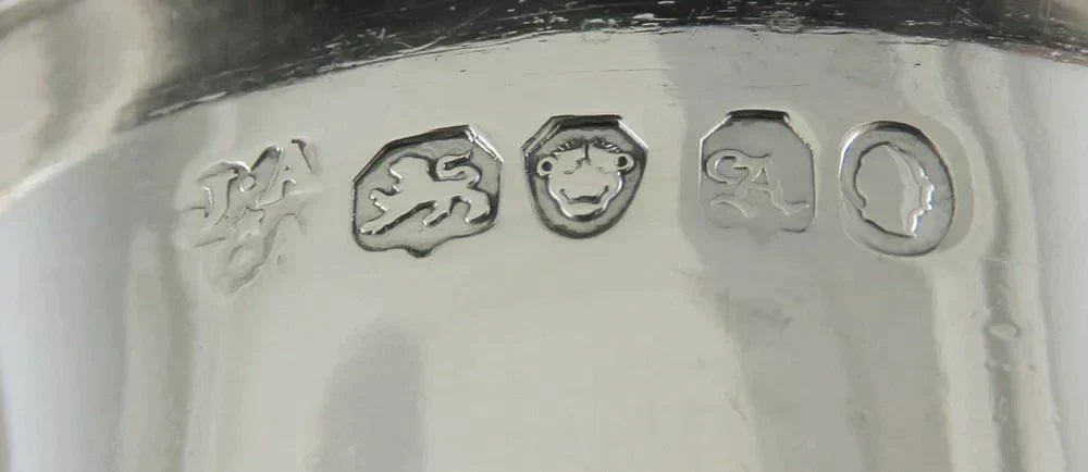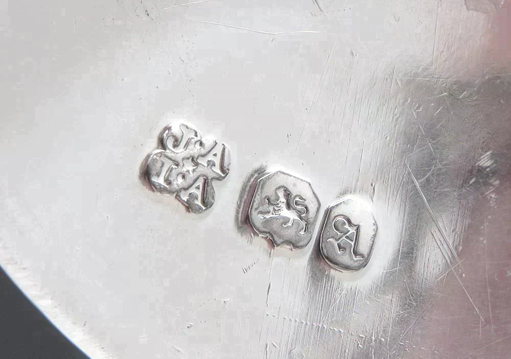 The body of the pot and the lid are marked with the lion passant for sterling silver purity, a date letter A for the year 1836 and a maker's mark for Joseph Angell I & John Angell I. The body is also marked with the leopard's head for the city of London and a duty mark of the king's head. The spoon also has a full set of English hallmarks.