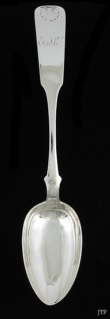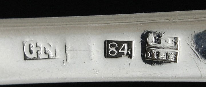 The spoon is hallmarked on the reverse with the 84 mark for Russian 875 purity silver, an assay master’s mark including the date 1845, a city mark, and a maker’s mark of GN. The city mark is far too worn to make out, but the rest of the hallmarks are easily discernible. Probably made in Moscow or St. Petersburg