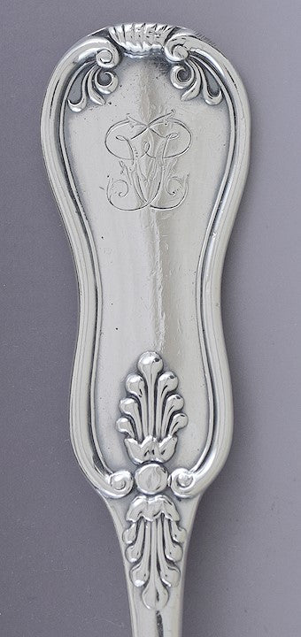 Presented is a fabulous Scottish Victorian sterling silver serving, platter, or stuffing spoon. This spoon dates to 1846 and was made by Robert Gray & Son. The spoon is done in an attractive, classical form, similar to the King or Kings pattern, with a foliate, shell and scroll design around the end of the handle. The spoon is well made from thick, heavy gauge silver, with a nice feeling of weight in the hand. The front of the terminal of the handle has a mirrored style monogram, of two S's or maybe P's back to back.
