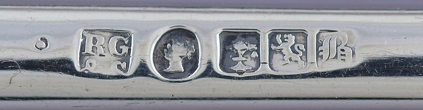 This piece is hallmarked on the underside with the lion rampant for sterling silver, the fish and tree mark for the city of Glasgow, the date letter b for 1846, Queen Victoria's head duty mark, and the maker's mark for Robert Gray & Son.