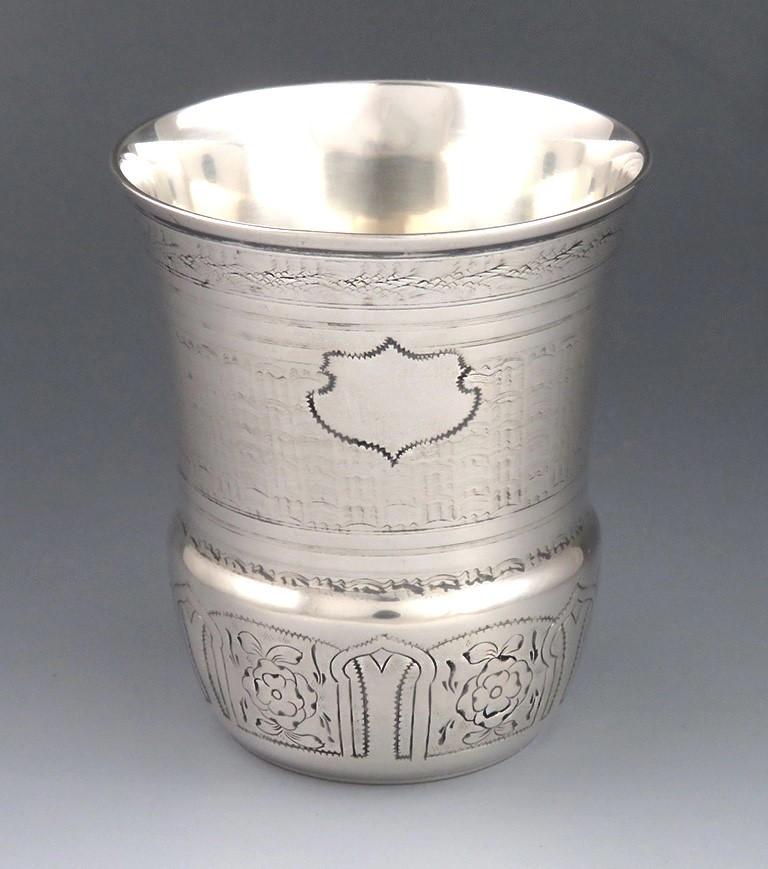 Presented is a completely hand crafted, Russian silver vodka cup made in 1874. The date of this cup is in the worn hallmark, it is definitely 19th century and you can tell the last number is a 4, we believe that the most accurate time frame for the cup would be the 1870s. The cup is engraved with flower decorations and an unmonogrammed shield cartouche. The cup is a good weight for its size.