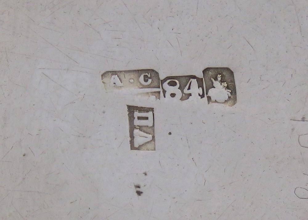 The underside has hallmarks for Mosco, 84 for 84/96 or .875 purity silver and a date mark that we believe to be for 1874.