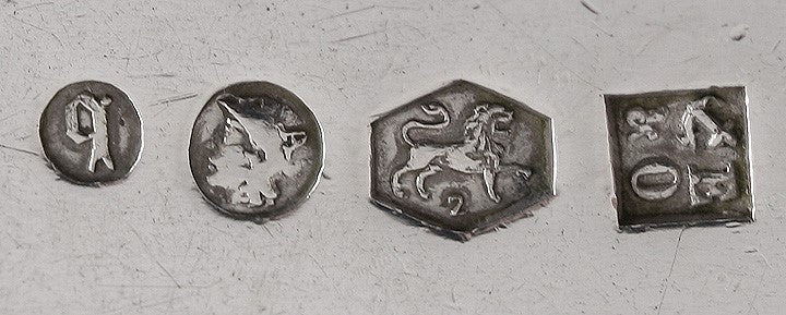 The back is marked with the lion passant for .833 purity silver, the Minerva head duty mark, date letter q for the year 1875 and a maker’s mark.