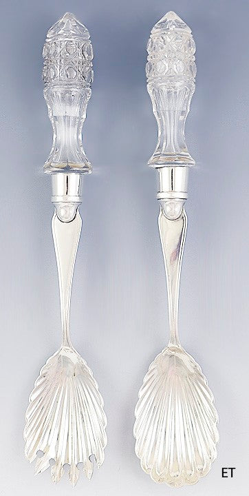 Presented is a wonderful Victorian English sterling silver and cut glass salad serving set. This set was made by John Grinsell & Sons and dates to 1885. The set consists of a spoon and fork, with fancy cut glass handles. The bowl of the spoon and the tines of the fork have a scalloped shell design. Use these fabulous pieces to serve salad, lobster, or whatever else you like, as a set or individually.