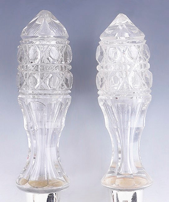 The set is in great overall condition. The cut glass handles have some knicks and fleabites, with a chip to the end on both the spoon and the fork. The fork has had a repair to one of its tines. There are no monograms and no monogram removals.