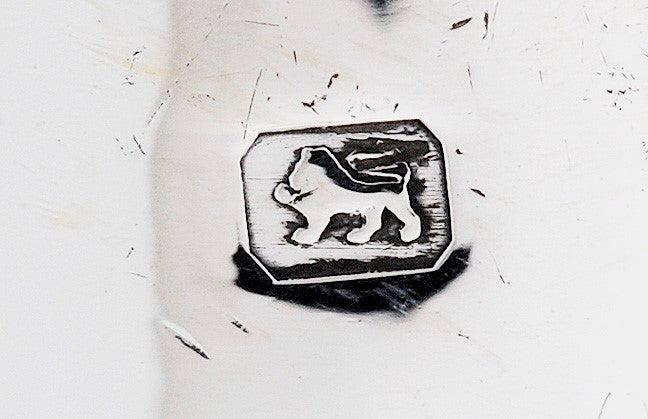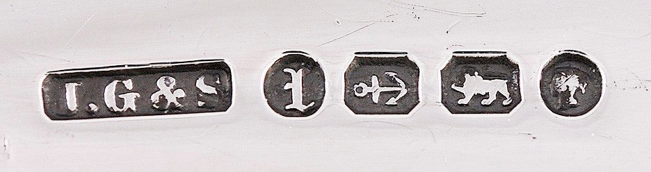Each piece is hallmarked on the back of the stem with the lion passant for sterling silver, the anchor for the city of Birmingham, the date letter I for 1885, the Queen Victoria's head duty mark, and the maker's mark for John Grinsell & Sons. The bolster of the handle on each piece is also marked with the lion passant.
