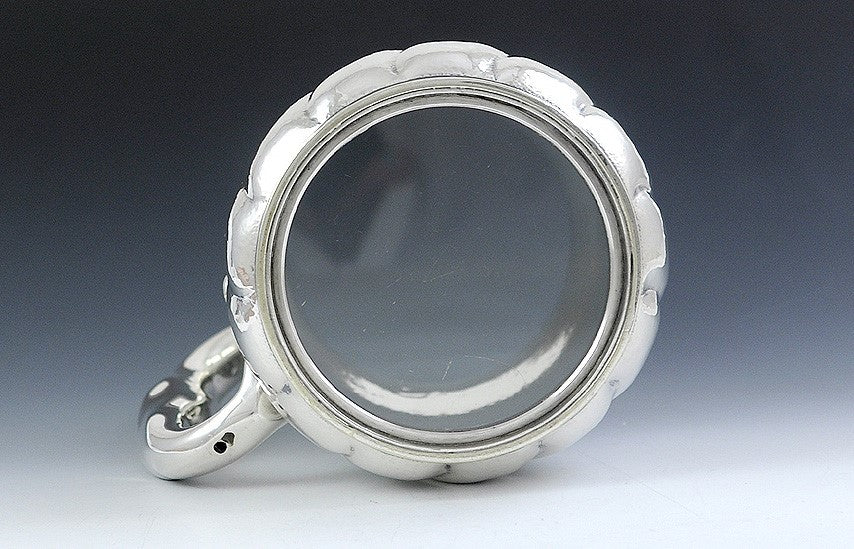 Presented is a fine American sterling silver tankard that was most likely made by Tiffany, Gorham, or Whiting. Presented on June 22, 1887, it is beautifully hammered and very heavy. A monogram and inscription are engraved on the side. The bottom was at some point removed and replaced with glass, so there are no hallmarks. This alteration was professionally done, perhaps even at one of the factories. Wonderful style and the best quality.