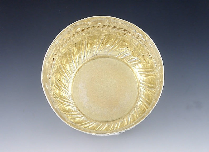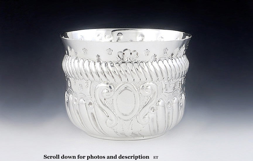 Presented is a wonderful Victorian English sterling silver cup. This piece dates to 1890, though it is done in the style of a late 1670s cup, something like a James II or Commonwealth period piece. The cup is nicely made and has decorative ribbing and gadrooning around the exterior. The interior has a gold wash. There is a blank oval cartouche, perfect for a monogram of your choice.