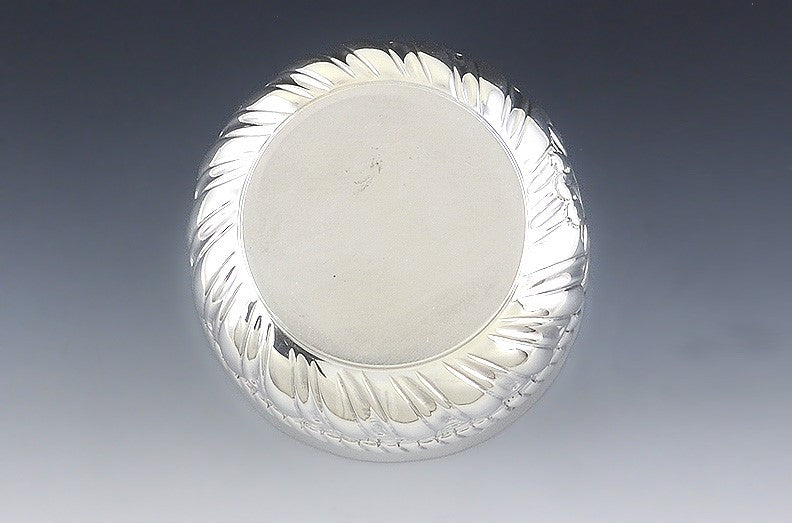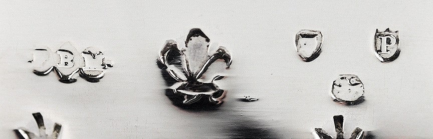 This piece is hallmarked on the side with the lion passant for sterling silver, the leopard's head for the city of London, the date letter P for 1890, and a maker's mark for Frederick Bradford Macrea of the Army & Navy Cooperative Society Ltd.