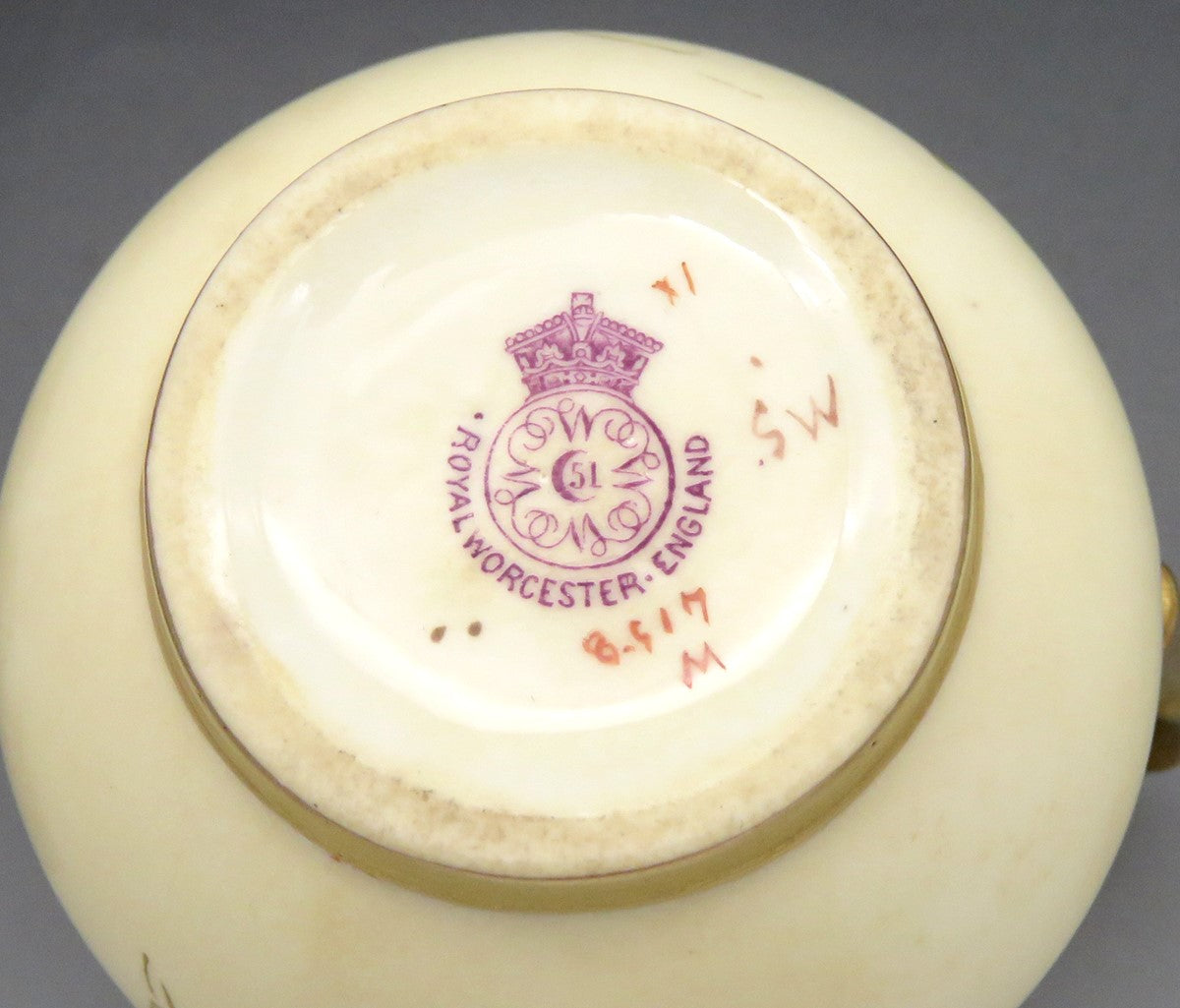 The underside bears the Royal Worcester mark used between 1891 and 1892 with a dot on the right side, above the word Royal.