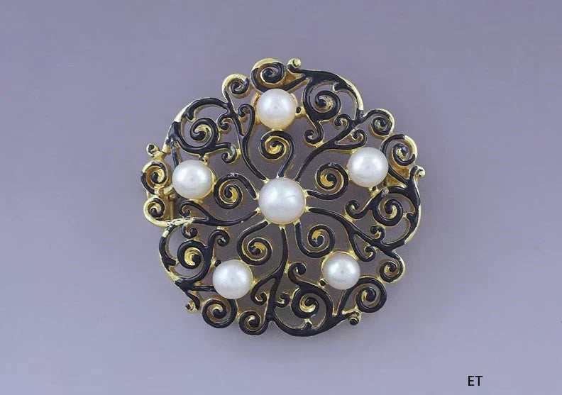 Presented is a fabulous 18 karat gold, pearl and enamel pin or pendant. This is an American piece, dating to around 1890-1910. The pin is done in a beautiful scrollwork filigree design, decorated with black enamel for a very striking effect. The pin is set with five pearls surrounding a slightly larger pearl in the center, all real, natural pearls given the time period. The pin has an old C clasp in the back, as well as a loop/bail that folds down, so it can be worn as a brooch or pendant, whichever you prefer.